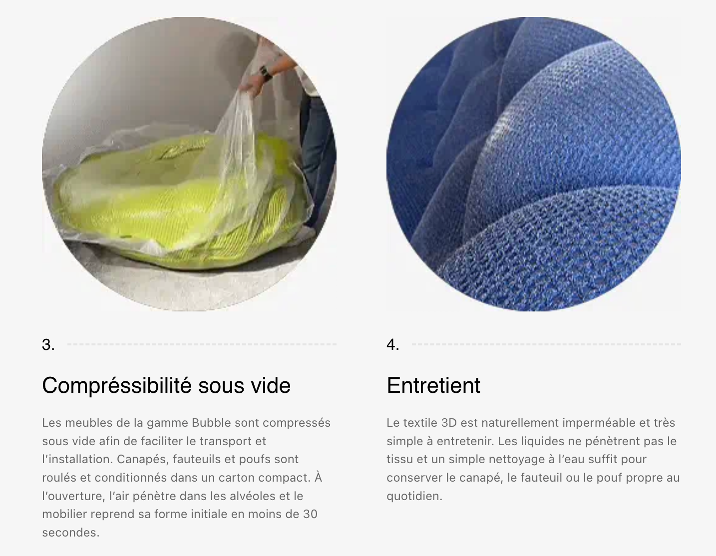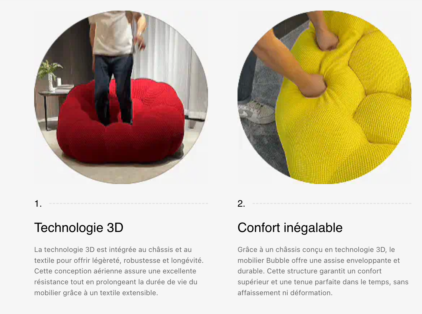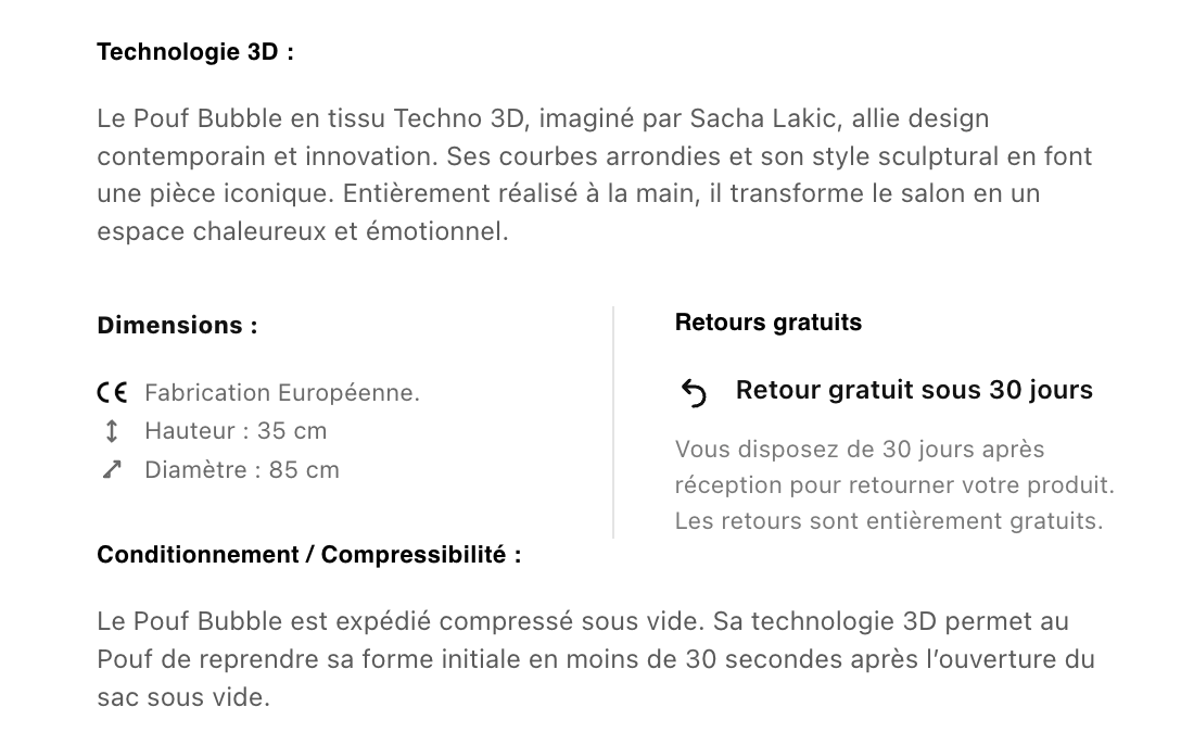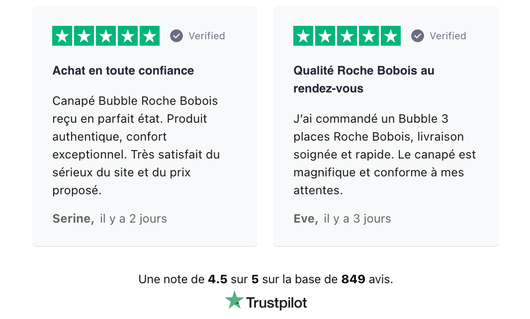 Vous bénéficiez d’une garantie “satisfait ou remboursé” de 14 jours à compter de la réception de votre produit. Durant ce délai, vous pouvez demander le retour de votre canapé, fauteuil ou pouf si celui-ci ne vous convient pas.