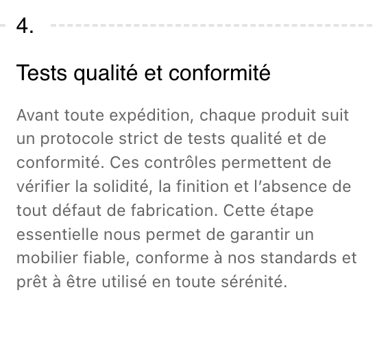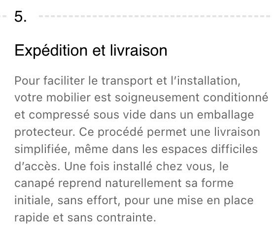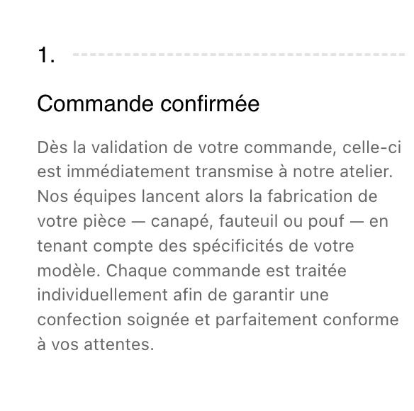 Les délais de livraison peuvent varier de 4 à 7 jours. Nous vous enverrons un mail une fois confirmation de votre commande. Tout au long de la fabrication de votre canapé, fauteuil ou pouf, vous recevrez aussi des emails de suivi vous informant de chaque étape de l’avancement de votre commande. De la mise en production jusqu’à l’expédition, vous êtes tenu informé pour une expérience totalement transparente et sereine.